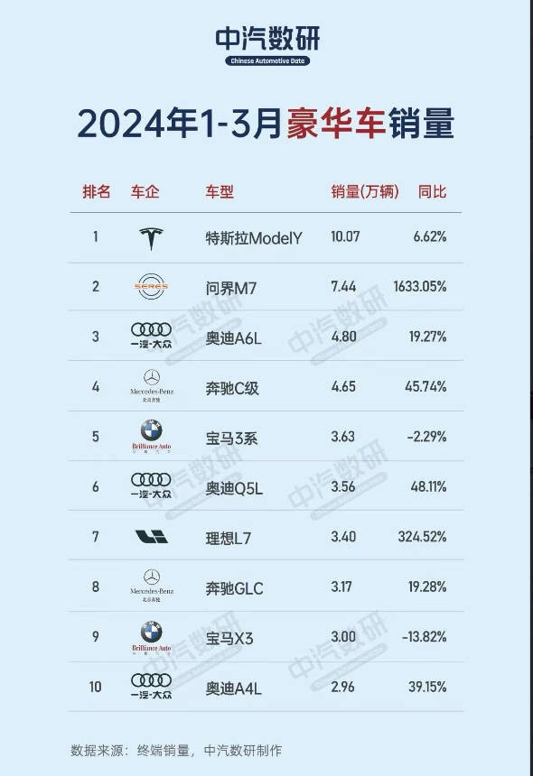 2024年第一季度中国豪华车销量排名:问界M7杀到第二